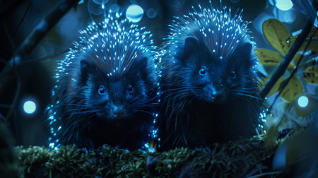 Two enigmatic animals with luminescent spines hidden amongst foliage under the mystical glow of a moonlit night.