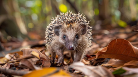 A Madagascar Hedgehog Tenrec can be seen walking through a forest floor covered with fallen leaves. The spiky creature moves amongst the foliage, blending in with the earthy tones of the environment.