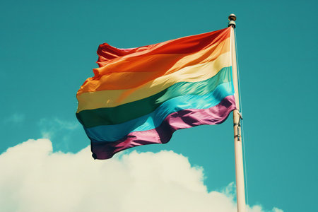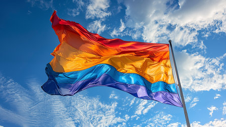 Rainbow flag waving in the wind against a blue sky with clouds