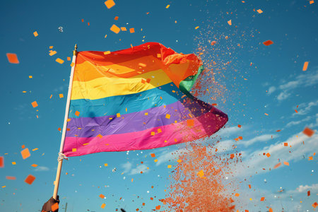 Rainbow flag waving in the wind against blue sky with orange confetti