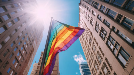 In city downtown, looking up to the sky, LGBT flag a rainbow colored flag. Generative AI image weber.
