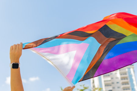Progress pride flag (new design of rainbow flag) waving in the air with blue sky, Celebration of gay pride, The symbol of lesbian, gay, bisexual and transgender, LGBTQ community.