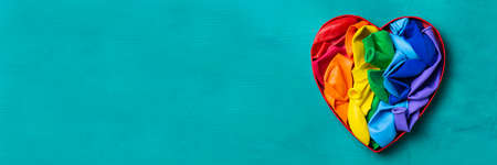 Heart shaped rainbow lgbtq flag against turquoise background, pride month