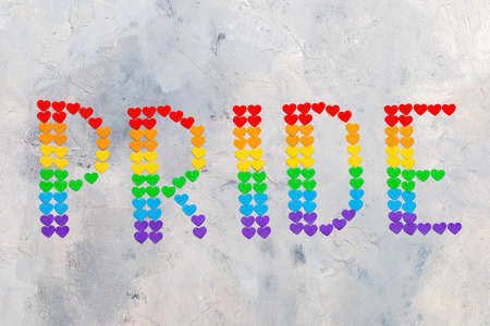 The word PRIDE of small hearts in the colors of the flag of the LGBT community