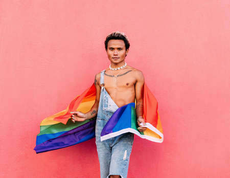 Cheerful man with gay pride flag against a pink wall. Young male with LGBT flag looking at camera outdoors.