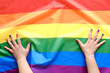 Happy Pride Month. Simple, minimal LGBT pride flag decor. Hands with rainbow painted nails on top of stripy flag in colors of the rainbow. Flat lay, top view, minimal casual design.