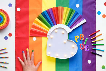 Rainbow LGBT flag background with frames, fan, pencils and ribbons. Hand with painted nails. Lightboard in shape of heart. Flat lay, LGBTQIA pride decor. June, diversity awareness month with light board.