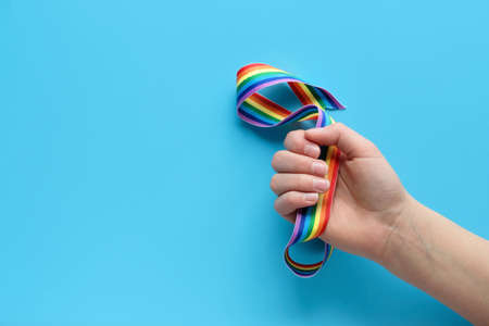 Rainbow ribbon in child hand. Blue mint paper background.