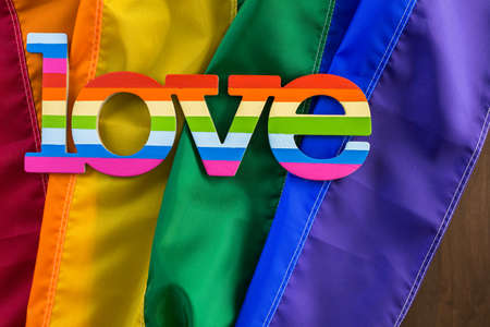 Rainbow Gay Pride flag with Love sign.