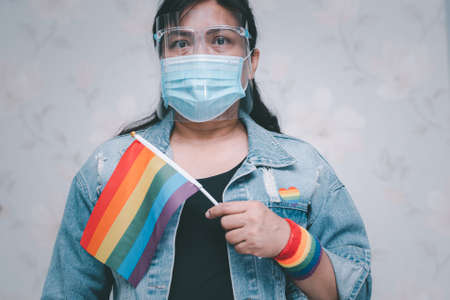 Asian lady wearing blue jean jacket or denim shirt and holding rainbow color flag heart, symbol of LGBT pride month celebrate annual in June social of gay, lesbian, bisexual, transgender, human rights.