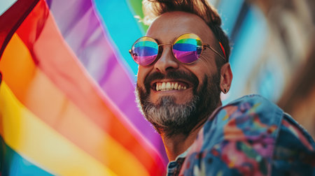 Generative AI, gay man smiling with rainbow flag, LGBT people walking in the street during the gaypride pride