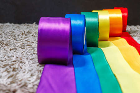 ribbons in the color of the lgbt rainbow flag in bobbins are rolled out on the carpet using how to celebrate homosexuals, gay, lesbian and concepts