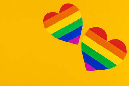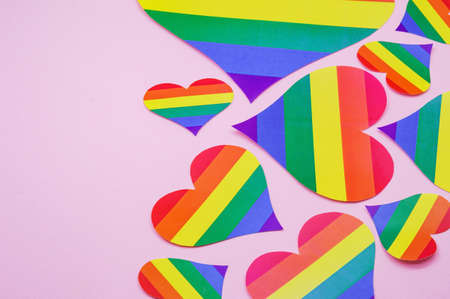 Multicolored paper hearts, a symbol of LGBT, a rainbow flag. Horizontal photo