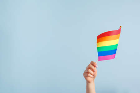 Gay flags in womens hand on grey background
