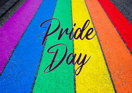 Rainbow painted on the street. Rainbow with the text: Pride Day. Photo related to Pride Day. June 28. Rainbow symbol LGBT. Love .LGBTQ Pride month. Poster, flyer or background related to Pride Day.