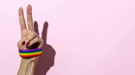 Woman hands with LGBT bracelet on pink background