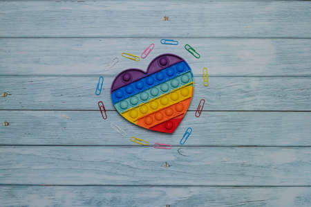 LGBT-colored paper heart. A heart made of paper on a blue background. The heart is rainbow colored. A symbol of the gay community.