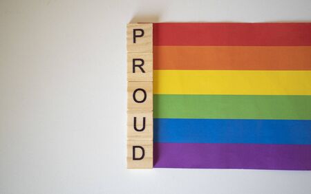 Proud with Pride LGBTQ+ rainbow flag on a white background