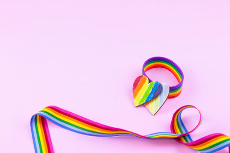 LGBT rainbow ribbon pride tape symbol. Pink background. Copy space for text