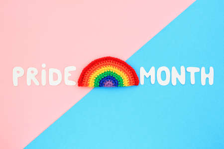 Crochet rainbow and Pride Month lettering on blue and pink background. LGBT flag gay pride community, equal rights movement and gender equaluty life concept. Flatlay idea for postcard, banner, poster