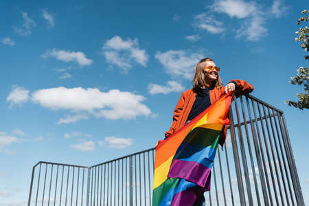 low angle view of smiling woman with lgbt flag against blue cloudy sky