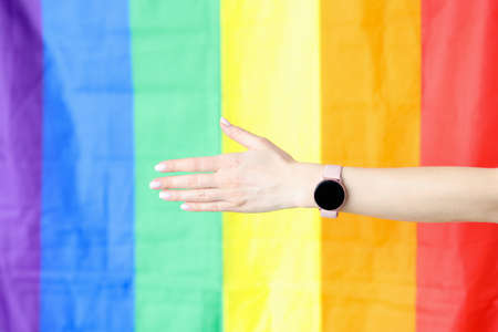 Closeup of outstretched hand with wristwatch against lgbt flag background. LGBT rights concept
