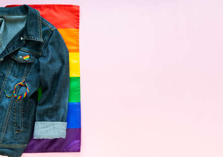 Gay flag and denim jacket with LGBT accessories. Copy space. LGBTQIA culture.