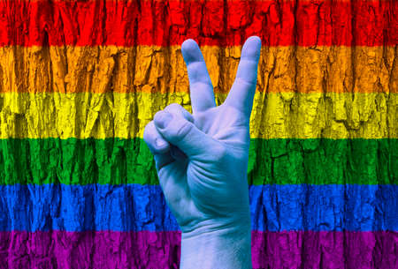LGBT. Victory gesture on a rainbow background on the texture. Template. Content for the designer.