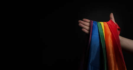 LGBTQ pride flag. Lesbian Gay Bi sexsual Transgender Queer. Homosexsual pride Rainbow flag in gay hand. black background. Represent symbol of freedom, peace, equality and love. LGBTQ concept.
