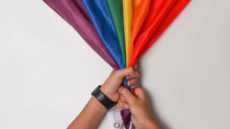 Woman hand holding LGBT pride flag on white background.