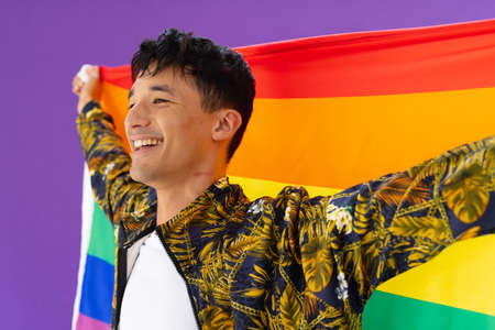 Happy biracial man holding lgbt rainbow flag and smiling on purple background. Lgbt and pride concept.
