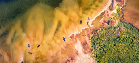 Straight down view from flying drone of shore and fishing boats on Svityaz lake. Panoramic summer view of Shatsky National Park, Volyn region, Ukraine, Europe. Travel concept background.