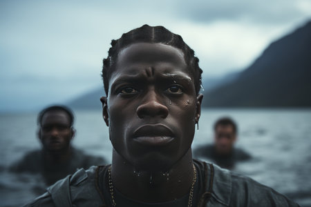 a powerful scene of a black individual with braided hair swimming gracefully through the ocean, capturing the resilience and emotion of migration
