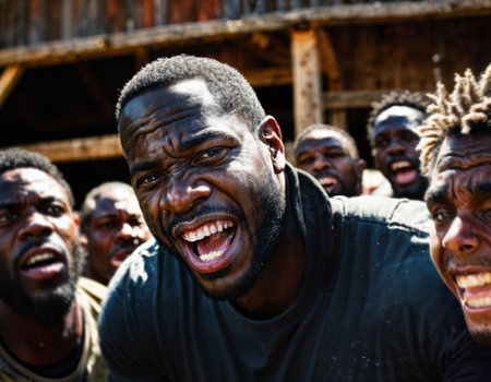 Men and women passionately express their beliefs by shouting together, their vibrant t-shirts contrasting against the muted tones, embodying unity and determination.