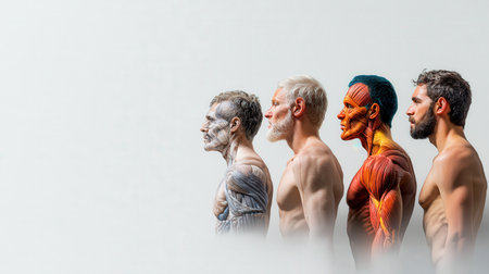Four men are standing in a row, each with a different skin tone and facial features. The image is a representation of the diversity of human anatomy and the beauty of individuality