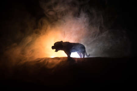 Silhouette of a tiger miniature standing at foggy night. Creative decoration with colorful backlight with fog. Selective focus