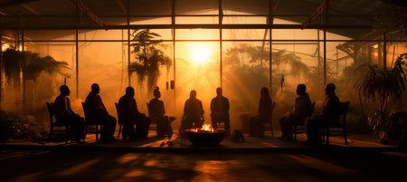 This image features silhouetted figures observing a cloud of smoke or vapor against an atmospheric backdrop. The composition showcases a dark and moody scene with a gradient of colors from deep blues to warm oranges. The lighting is diffused, suggesting an outdoor environment. This visual is suitable for conceptual or editorial applications.