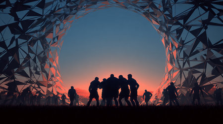 Silhouetted figures against a backdrop of digital connections, symbolizing networking and innovation in the tech world.
