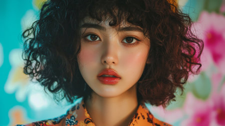 Adult Chinese Woman with Brown Curly Hair photorealistic illustration.