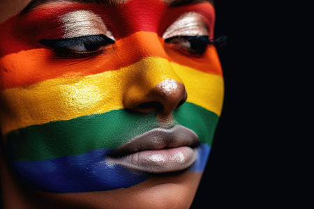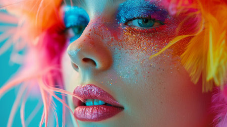 A closeup of a young woman with a painted face in a vibrant rainbow of colors, AI-generated.
