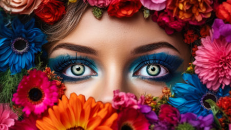 Closeup of a Woman's Eye with Pink Flowers and Glitter Makeup