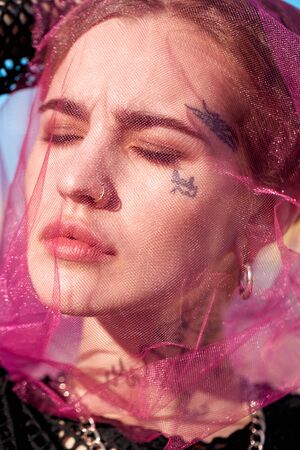Urban Style. Young stylish woman standing outdoors face under veil close-up closed eyes wincing concerned