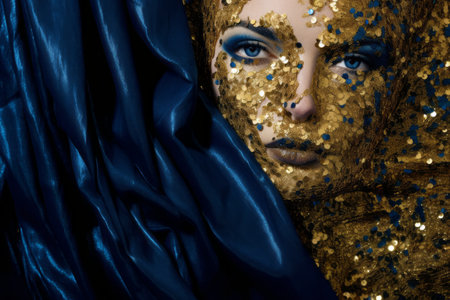 Woman face with elaborate fantasy makeup, featuring shimmering blue and green scales and glitter, applied by a professional artist.