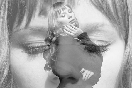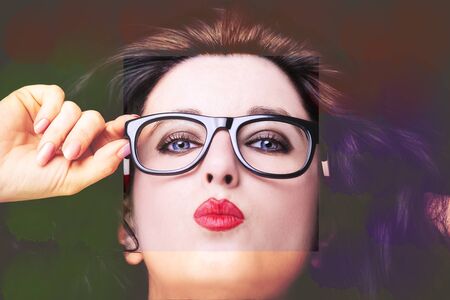 Young woman face reflected in broken mirror pieces with emotional expression and soft lighting