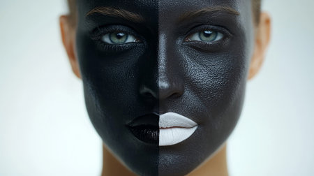 Light And Dark, A Studio Portrait Of A Woman With Half Her Face Shaded In Black And White Makeup