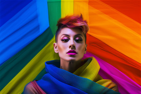 An AI generated illustration of A young person with short, vibrant red hair stands against a backdrop of vivid rainbow colors