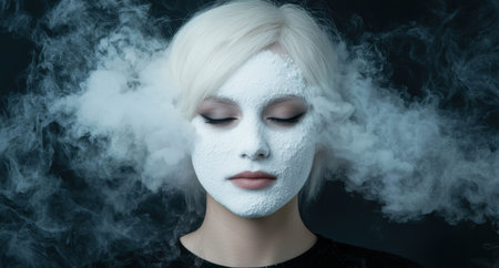 A young woman showcases bold makeup featuring bright colors, complemented by a swirl of pink smoke, creating an artistic and vibrant atmosphere against a blue background.
