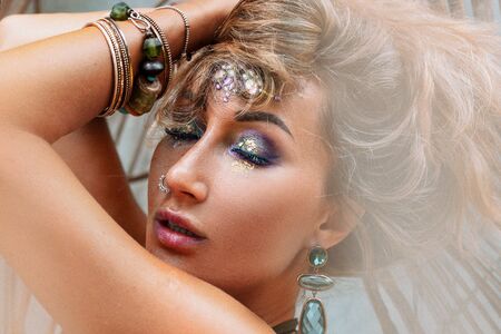 Sensual beautiful young woman with bright stylish makeup and eyes closed