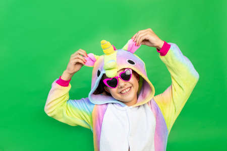 a little girl is sitting on a green isolated background with a streamer in a bright suit and glasses. Space for text. The concept of a holiday, Birthday and sales