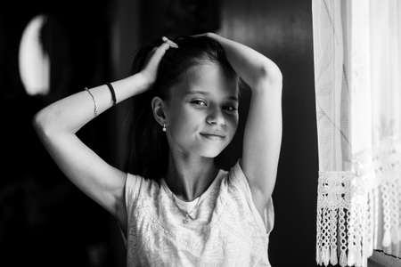 Portrait of cute ten-year-old girl posing for the camera. Black and white photo.